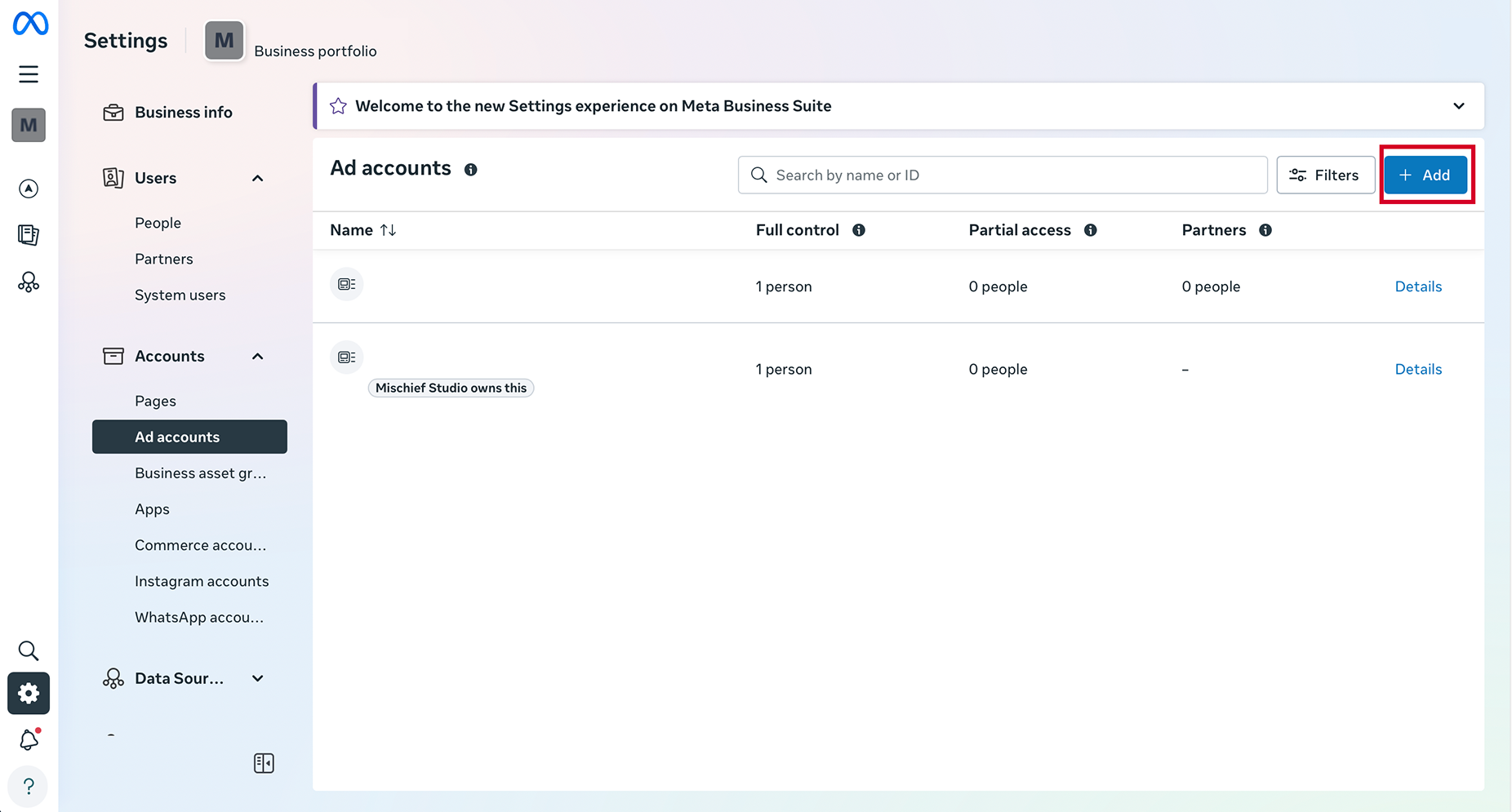 Selecciona la opción “Cuentas de Anuncios (Ad Accounts)”. Click en “Agregar+ (Add+)”